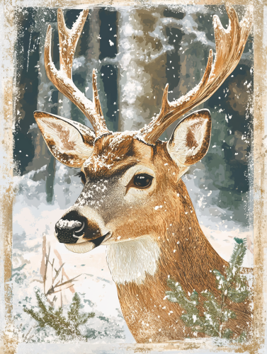 A beautiful deer in the snow, vintage-style illustration, flat design with boho colors and retro patterns, crisp lines, vintage poster art style, simple shapes, vintage postcard aesthetic, 1950s-1960s era, retro feel, nostalgic feel, use a vintage palette, 2D vector graphics, simple shapes, flat color blocks, a clipart set. --ar 3:4