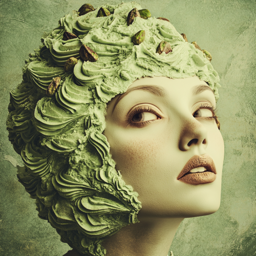tiramisu cake woman, non- realistic face, dessert sculpture, vintage photography, realistic textures, pop surrealism, pistachio, Italian vintage posters, colors: cream, green, brown