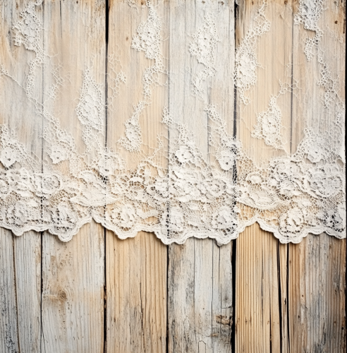 Vintage lace panels on a rustic wood background. Old shabby chic wall with vintage lace panels on wooden planks, neutral colors, texture, and detail. Vintage lace panels on an old wood background. --ar 49:50