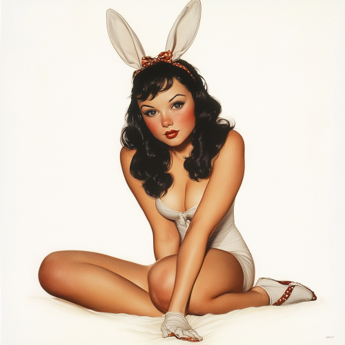 play bunny, vintage poster girl, black hair, vintage poster girl, cool pose, realistic, plain white background, in the style of Frank Frazetta, vintage, colour