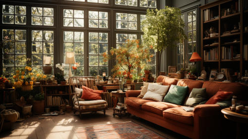 Wide angle of a 1940 living room with a Christmas tree in front of a big picture window. Outside the window other decorated homes can be seen. --ar 16:9 --s 1000
