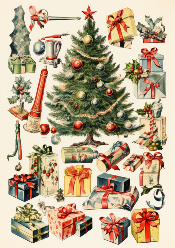 1940's Christmas ephemera clipart, white background --no people --v 5.2 --s 250 --ar 5:7