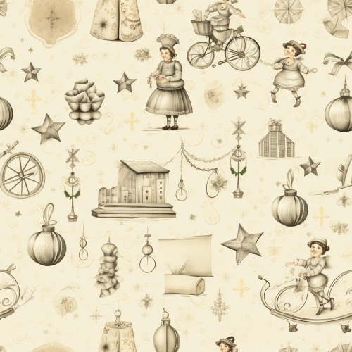 Vintage Christmas toys and Flourished scripts in a Soft Grey and Antique Ivory color palette in a Vintage Chic style, Christmas themed seamless pattern --tile