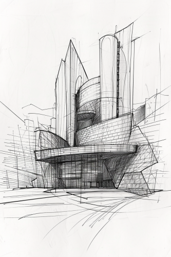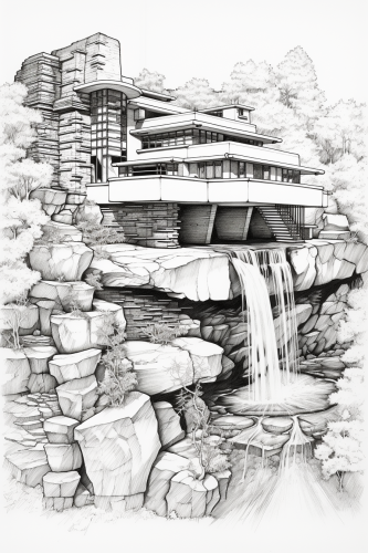 frank lloyd wright falling water house, Vintage architecture sketch art, architecture print, line art, ink drawing, architecture drawing, vintage drawing, minimalist wall art --ar 2:3 --v 5.2