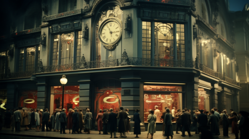 a big and fancy building, watch store, elegant people. vintage, 1950, sharp, hyperrealistic, analog, fujimilm. --ar 16:9