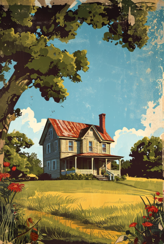 a farmhouse poster in the style of a vintage 1930s advertisement poster --ar 27:40 --v 6.0