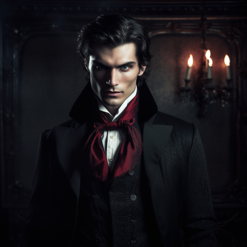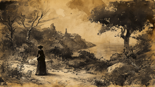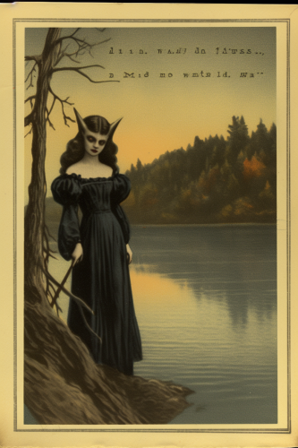 a 1920s halloween postcard of a female vampire by the lake, in the style of vintage ephemera, colorful woodcarvings, midwest gothic, black mountain college, horror --ar 2:3 --v 5.2