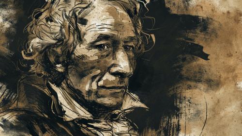 drawing of François Chollet's face over black background. vintage book illustration sketch. vignette. sepia colors. --ar 16:9 --v 6.0