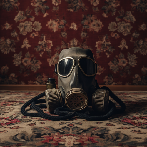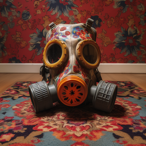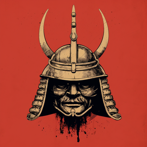 1960's japanese vintage clipart, a portrait of a samurai helmet isolated on a plain red backround, centered, silkscreen print, muted colors and rich ink hues, textured, nostalgic, vintage sepia, minimal --c 0