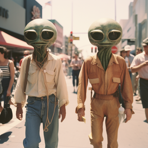 hillbilly aliens walking down the hollywood walk of fame in the 1970s, vintage style pic, uncanny, vintage-style pic, uncanny, 1970s, eerie, magical realism
