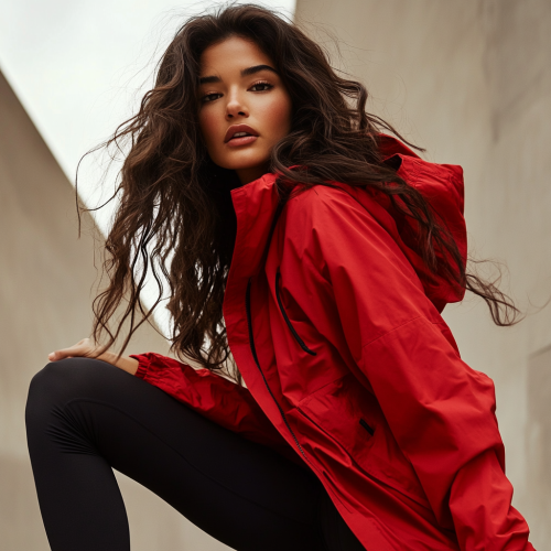 high resolution and ultra realistic high end fashion vogue style photography with peter lindbergh photography style, a photo of beautiful Brazilin woman in an oversized red windbreaker jacket, black leggings, standing poseing to the camera captured from a low angle. The background features a plain, light grey surface, creating a contrast between the dark attire and the bright backdrop. wavy beautiful hair, soft makeup, adding a characteristic detail to the scene. This dynamic pose highlights both the fashion style and the action while maintaining simplicity for commercial photography.