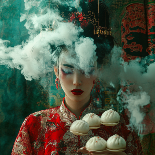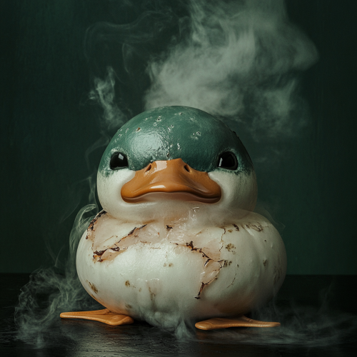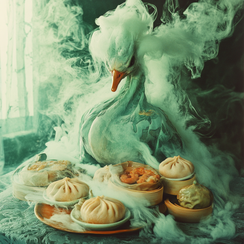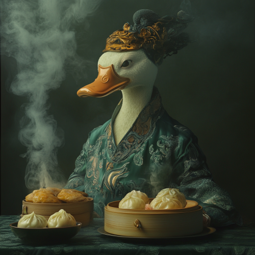 1970s Chinese mandarin duck creature, bao buns, dim sum, smoke, realistic textures, pop surrealism, vintage photography, style of Alexander McQueen, dark green