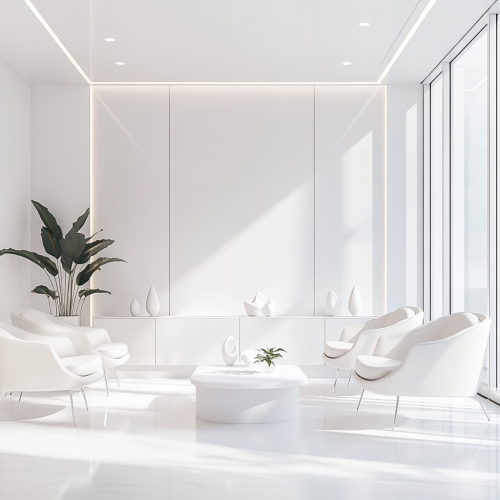 A pristine white, minimalist dentist's waiting room, 3D render, octane render, unreal engine, smooth, modern architecture, white leather chairs, simple white coffee table with a few abstract white sculptures, large window with soft diffused natural light, white walls, white floor, no people, sense of calm and serenity, high-resolution