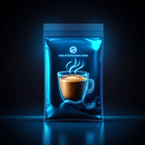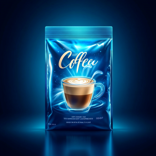 realistic instant coffee bag packaging, logo and brand name at top, has a cup of caffe latte in a clear cup on the bag, energy feel, use blue and white neon colors