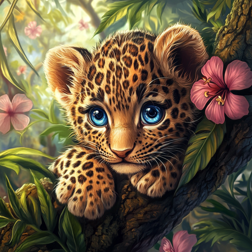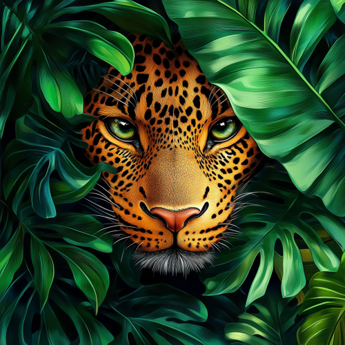 bright colorful realistic drawing with 3D digital art paints the face of a leopard hidden behind bright green tropical leaves, only bright eyes are visible