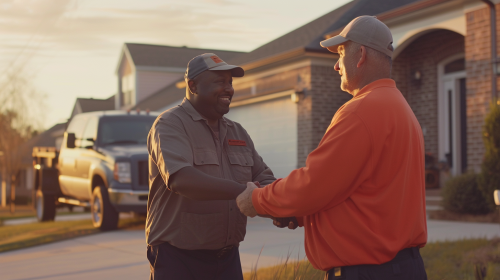 An emotional moment captured as a Carl Moving worker shakes hands with a satisfied customer in front of their new home, moving truck visible in the background, sunset casting golden hues over the scene, hd detail, vibrant color grading, Canon 5D realism, friendly atmosphere --ar 16:9 --v 6.0