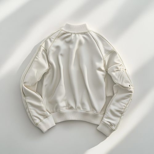Photorealistic front and back flat lay of an oversized, boxy-fit varsity jacket with premium details. The body of the jacket is textured with a soft, high-quality fabric in a clean white, paired with smooth leather sleeves in a contrasting colour. Shot on a clean white studio surface with soft lighting from the right, creating subtle shadows that highlight the jacket’s luxury textures and stitching. Captured as if by a high-end fashion photographer in a professional studio, showing precise details like ribbed cuffs, collar, and hem for a polished look. ar 5:4