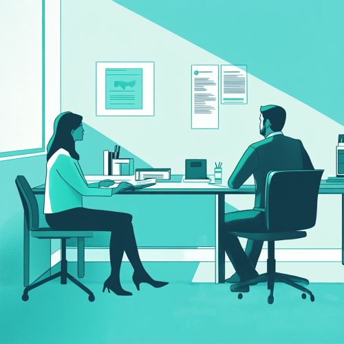 A Infographic illustration representation of Infographic illustration showing a professional setting with a person sitting across a desk from an interviewer. The person appears confident and is discussing their layoff experience. Use shades of teal and white for the color scheme. No text on the background. --ar 1:1