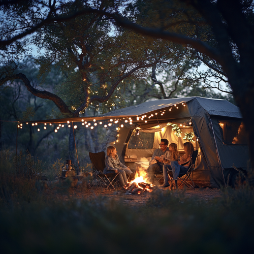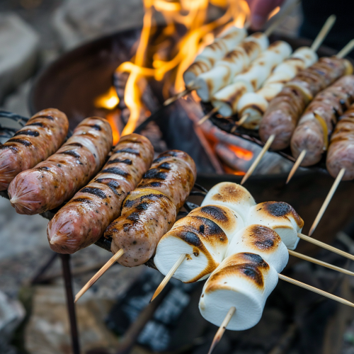 Close-up of grilled sausages and marshmallows on skewers by a bonfire, team members sharing and enjoying food, Canon EOS 5D Mark IV, 35mm, f/5.6, real 35mm photo, photorealistic, vibrant colors, mouth-watering details, cozy outdoor dining experience --v 6.0 --s 50