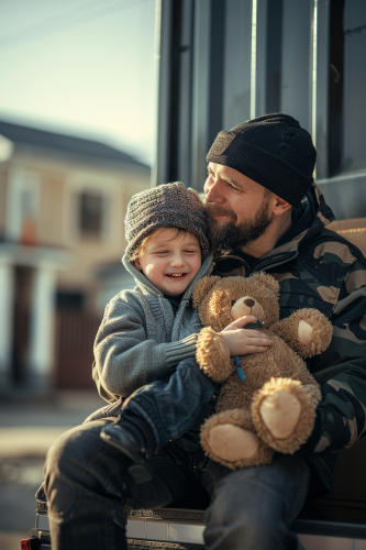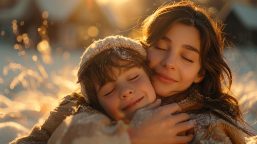 Create an ultra-realistic image focusing on the joy and emotion of a family celebrating the purchase of their dream home. The family should be at the center of the image, embracing each other, smiling, and expressing happiness, as if they’ve just received the keys to their new home. Capture personal moments like parents hugging children, joyful expressions, or celebratory gestures. The house can be subtly visible in the background, slightly out of focus, to enhance the sense of accomplishment without distracting from the emotional connection of the family. Use natural lighting and warm tones to evoke happiness and excitement. No text should be included. --ar 16:9 --v 6.0 --s 750