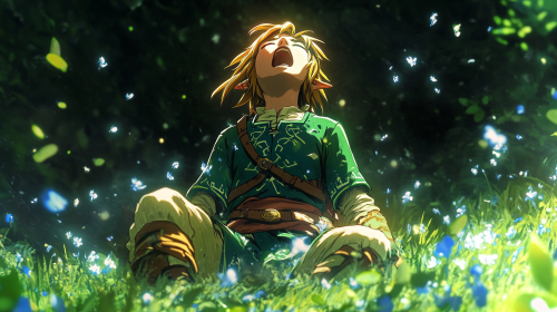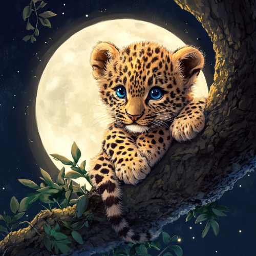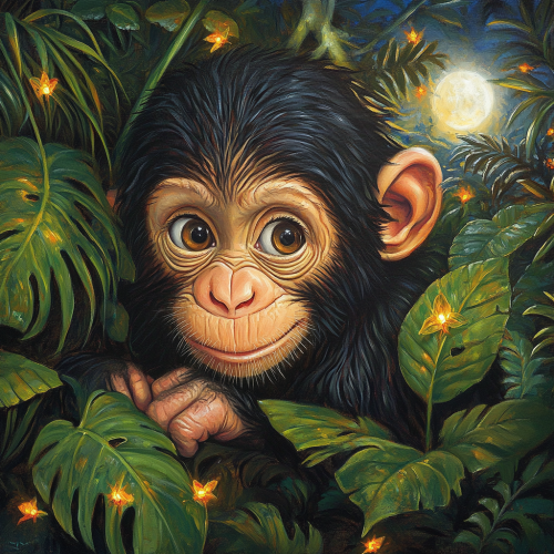 colorful realistic oil painting close-up of a baby chimpanzee in a bright, lush jungle setting. The chimpanzee's large, expressive eyes reflect the light of the moon visible in the background sky. Surrounded by lush green foliage and glowing fireflies, this scene evokes a magical, peaceful feeling. The leaves of the plants are brightly colored, some turn yellow, indicating the change of seasons.The detailed textures on the chimpanzee's fur and living forest make this scene both charming and captivating.