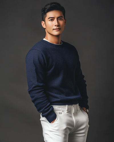 man in his mid 30s in a casual navy blue sweater outfit, white pants, studio backdrop, half body shot, photorealistic, active space on top --no beard --ar 4:5