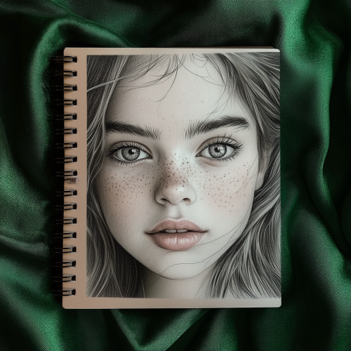 A pencil sketch of 12 years old girl big eyes thin lips freckles, Medium portrait Shot , on a spiral page notebook , in the style of realistic shaded pencil sketch,with visible pencil sketch marks, and a smooth velvet forest green cloth behind the notebook --ar 1:1 --v 6.1