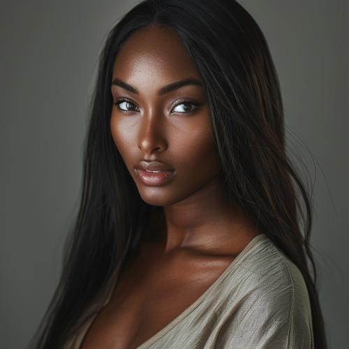 Beautiful African American woman with a long, straight lace front wig, wearing a neutral-colored V-neck top in her fashion studio. She has glamorous makeup and is looking at the camera. Her hair is black. High-resolution photography. Realistic, deep skin tones. --v 6.0
