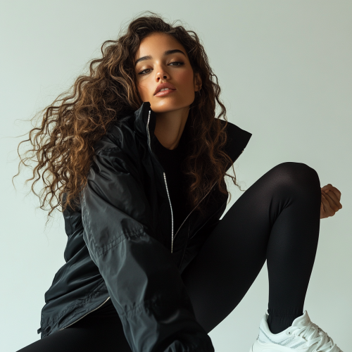 imagine high resolution and ultra realistic high end fashion vogue style photography with peter lindbergh photography style, a photo of beautiful Brazilin woman in an oversized black windbreaker jacket, black leggings, and white sneakers poseing to the camera captured from a low angle. The background features a plain, light grey surface, creating a contrast between the dark attire and the bright backdrop. wavy beautiful hair, soft makeup, adding a characteristic detail to the scene. This dynamic pose highlights both the fashion style and the action while maintaining simplicity for commercial photography.