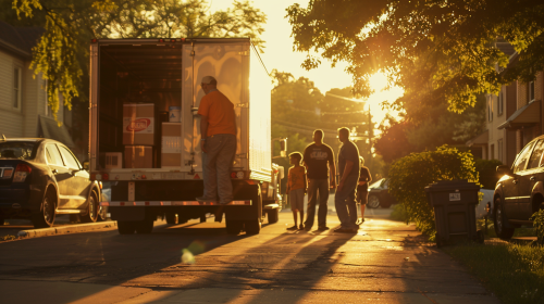 An emotional moment where Carl Moving staff and family members share a group photo, standing by the loaded moving truck in a friendly neighborhood setting, golden hour lighting casting a warm glow, vibrant color balance, Canon soft-focus effect, hd realism, sense of unity --ar 16:9 --v 6.0