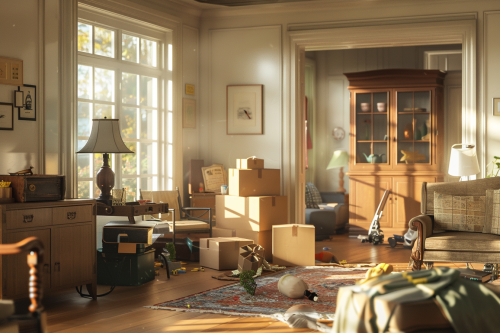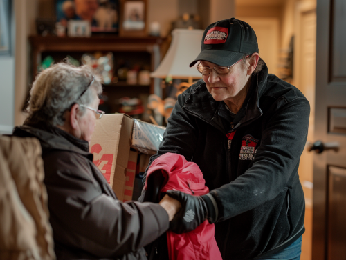 A warm, heartfelt moment of a Carl Moving team member carefully helping an elderly woman pack her belongings, a gentle smile exchanged, soft indoor lighting that adds warmth, cozy background with family photos and memorabilia, Canon 5D Mark IV quality, natural color palette, hd realism --ar 4:3 --v 6.0