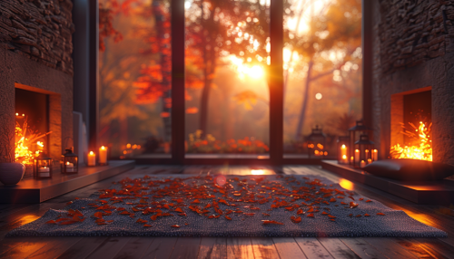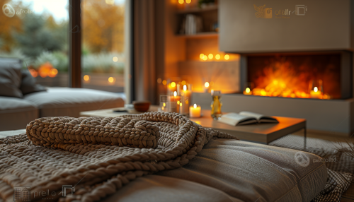 realistic photo of the interior of a modern, spacious apartment in a skyscraper. Despite the modern decor, the apartment is very cozy. Looking at the photo, you would like to give yourself over to relaxation. In the central part there is a fireplace. There are lots of candles and lanterns in whole apartment. A thick blanket is loosely placed on a white sofa. On the coffee table there are books and two glasses of wine. Outside the window it is night and an autumn rain is falling. --ar 7:4 --s 750 --v 6.0