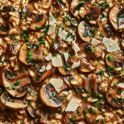 A high-definition image of a creamy mushroom risotto, with tender slices of sautéed mushrooms and finely chopped black garlic mixed into the velvety rice. The risotto is garnished with freshly grated parmesan and a sprinkle of chopped parsley, giving a vibrant green contrast to the warm, earthy tones of the mushrooms and rice. The natural lighting highlights the smooth, creamy texture of the risotto and the glossy, caramelized mushrooms, captured in stunning 8K resolution to showcase the depth of flavors and luxurious simplicity of this comforting dish.