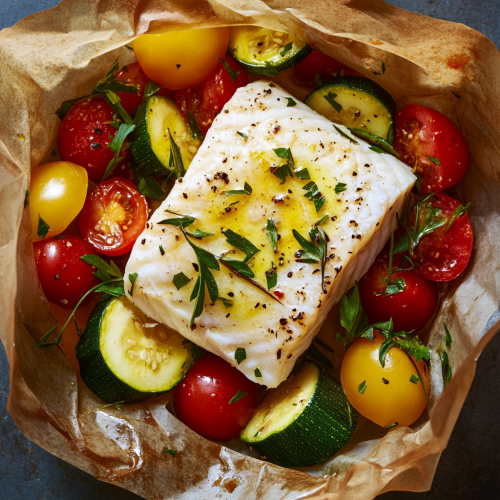 A high-definition image of a delicate white fish filet, perfectly cooked in a parchment paper papillote, surrounded by vibrant summer vegetables like zucchini and tomatoes. The fish is glistening with olive oil and lemon juice, with hints of garlic and fresh herbs visible. The steam escaping from the opened papillote enhances the visual, and the textures of the tender fish and crisp vegetables are highlighted under natural light. Captured in 8K resolution, the freshness and simplicity of the dish are displayed beautifully, with vibrant colors and fine details.
