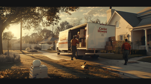 A photorealistic scene of Carl Moving’s team carefully loading boxes into a branded moving truck, employees in uniform smiling, working in sync, parked outside a suburban home, early morning sunlight casting soft shadows, truck logo visible, hd quality, Canon EOS camera sharpness, warm color grading, --ar 16:9 --v 6.0