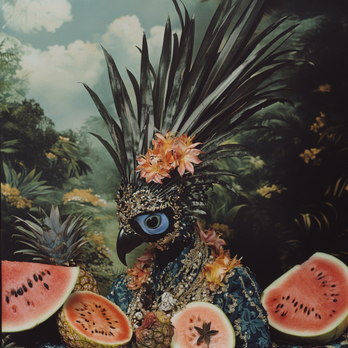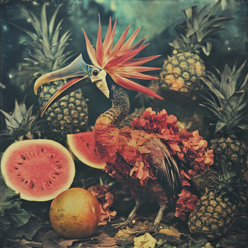1970s Indonesian bird of paradise flower creature, pineapples and watermelon, star anise, Bali, realistic textures, pop surrealism, vintage photography, style of Alexander McQueen