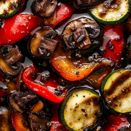 A high-definition image of beautifully roasted seasonal vegetables, including vibrant red bell peppers, zucchini slices, and mushrooms, drizzled with a glossy black garlic and balsamic vinaigrette. The vegetables are perfectly caramelized with golden edges, glistening under a warm, natural light. The bright colors of the vegetables are complemented by the deep, rich tones of the balsamic glaze. Captured in stunning 8K resolution, the textures of the roasted vegetables and the smooth, glossy vinaigrette are showcased in a visually captivating presentation.
