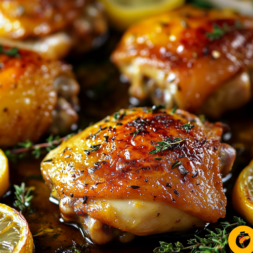 A high-definition image of golden-brown roasted chicken thighs, glistening with olive oil and beautifully seasoned with fresh herbs and lemon slices. The chicken is caramelized, with crispy skin and tender meat, surrounded by roasted lemon slices and sprigs of thyme. The vibrant colors and textures of the chicken, contrasted with the dark, glossy garlic and bright yellow lemon, are showcased under warm natural lighting, captured in stunning 8K resolution to emphasize the richness and simplicity of this wholesome dish.