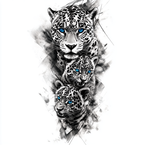 A detailed black-and-white tattoo design for a full arm sleeve, featuring powerful jaguars. At the top of the design, a fierce, life-sized jaguar with intense blue eyes looks outward with a calm, dominant expression. Below, a pair of jaguar cubs playfully interact, their bright blue eyes full of curiosity and life. Around them, geometric shapes and abstract lines subtly blend into the background, adding depth and flow. At the bottom of the sleeve, a roaring jaguar snarls with bared teeth, its eyes gleaming with vibrant intensity, creating a striking contrast. The design flows seamlessly with intricate details of fur texture and muscles, giving a hyper-realistic, lifelike appearance.