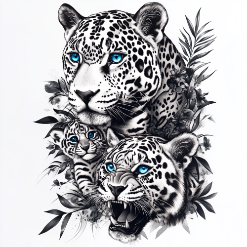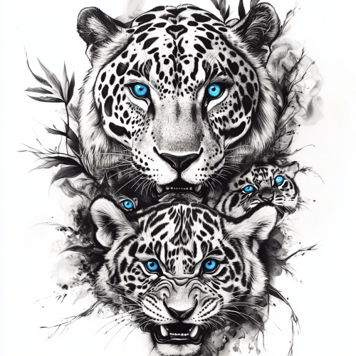 A black-and-white tattoo-style design featuring majestic jaguars. At the top, a large, regal jaguar with piercing blue eyes gazes forward, exuding power and wisdom. Below it, two playful jaguar cubs with matching blue eyes sit close together, showcasing their innocence and curiosity. Near the bottom of the design, a fierce tiger with glowing amber eyes bares its teeth, surrounded by sharp, geometric lines that add an intense, dynamic energy to the artwork. The entire piece is in a realistic style, with fine details emphasizing the fur texture and expressions, set against a smooth, flowing background.