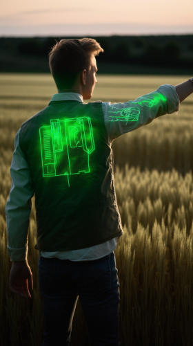 A man seen from behind, wearing a light-colored agronomist’s work shirt, jeans, and brown leather boots, standing in an open agricultural field. He raises one hand as if pointing or interacting with a holographic, neon-green HUD (Heads-Up Display) showing field statistics. The HUD glows with bright, LED-like green symbols and data panels, floating in front of him in the air with detailed agricultural metrics, weather patterns, and crop growth indicators. The scene is realistic, with the neon green HUD casting a faint glow on the man’s back, giving the impression of advanced technology in a natural environment. Hyper-realistic details on the textures of his clothing, the boots, and the futuristic feel of the glowing display. --v 5.0 --ar 9:16 --s 750