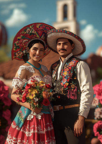 A picture of a mexicna wedding. This photo was taken using Canon EOS R5 mirrorless camera, with an EF lens set to f/20, ISO 8D, capturing every detail of his smile and her warmth., ultra-realistic photograph captured, high-resolution 3d rendering --ar 91:128 --v 6.1