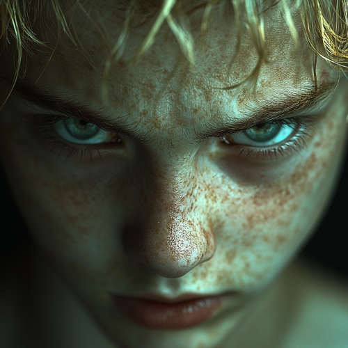 Photorealistic hd resolution image of a bad person. Young vilain psychopath. Angular face. Hawk aquiline nose. Flat blond hair. Very coward face. Bad evil eyes. Arrogant smile. --s 750