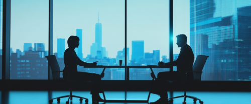 Generate a digital art for A digital art scene depicting a professional interview setting. The background shows a modern office with a large window, through which a cityscape is visible. The interviewer and interviewee are seated across a sleek table. The interviewee appears confident and composed, subtly addressing the topic of being laid off. The color palette prominently features shades of navy blue. --ar 12:5
