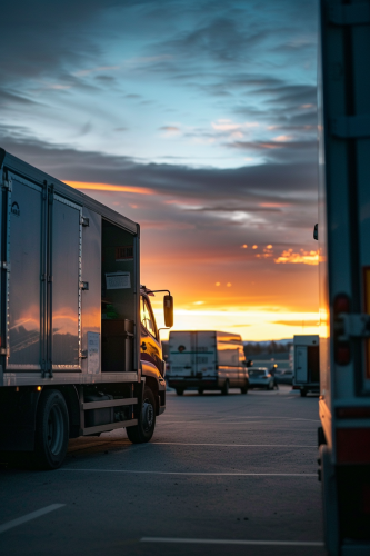 A peaceful dusk scene of a Carl Moving truck parked with its back doors open, ready for unloading, gentle evening light with hints of sunset, staff preparing to unload, professional and clean atmosphere, soft yet detailed shading, Fujifilm color palette, cinematic framing --ar 2:3 --v 6.0