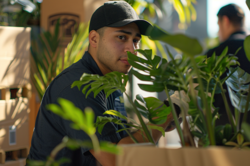 A candid close-up of Carl Moving staff loading plants and fragile items with extreme care, focus on each expression and careful handling, bright natural lighting highlighting details, high-definition, Canon realism, warm and inviting ambiance --ar 3:2 --v 6.0