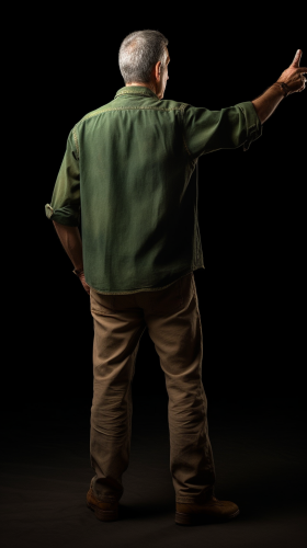A man viewed from behind, wearing a dark green agronomist’s shirt, jeans, and brown leather boots, standing as he gestures forward with one hand. He appears to be pointing or interacting with something in front of him, with no background or a realistic dark, softly shaded background that keeps the focus on him. The lighting subtly highlights the textures of his clothing--the rugged denim of his jeans, the worn leather of his boots, and the soft, functional fabric of his green shirt--emphasizing his role as an agronomist in a professional stance. Hyper-realistic detail, focusing on the textures, shadows, and the determined pose. --v 5.0 --ar 9:16 --s 750