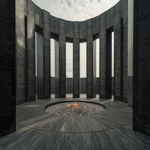 A memorial with enormous onyx piles, engraved with the entire list of names of the fallen soldiers. There are several columns forming a circle, in the center of it, in the middle of all the columns there is gravel and ashes. There is a perpetual fire that always burns.