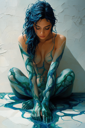 A full-body surreal oil painting of a woman in a serene pose, with her veins transformed into intricate reallistic rivers flowing across her skin, in trompe l’oeil style. Exquisite oil painting by Dali and Jean delville, Her skin appears translucent with winding blue and green rivers that shimmer and create a complex network around her body. The scene captures a calm, peaceful expression, with the entire body in view, framed by a softly blurred background that enhances the three-dimensional, lifelike quality of the river-like veins. Ethereal lighting and subtle highlights give the rivers a fluid, realistic effect, blending seamlessly into the surreal setting. --chaos 60 --ar 2:3 --stylize 888 --v 6.1