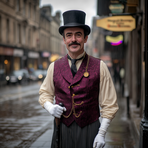 A well off man standing on the corner on a wooden sidewalk on a city street in Glasglow Scottland with a black cane, a tall black top hat, a maroon silk vest with gold buttons, a pocket watch hanging in his pocket with a chain, white gloves, white shirt with white cuffs and gold cuff pins, handle bar mustache with a goatee, dark facial hair and dark curly hair under his hat, he is happy, in the 1950’s, the sidewalk is wooden and his shoes are hard enough to clank when he walks, there are signs hanging in front of the buildings, it is raining, it is showing his entire body even his shoes --style raw
